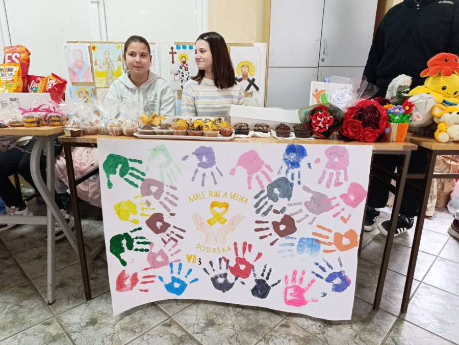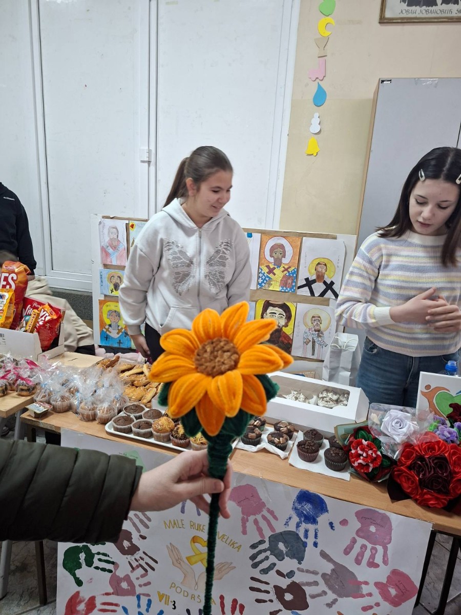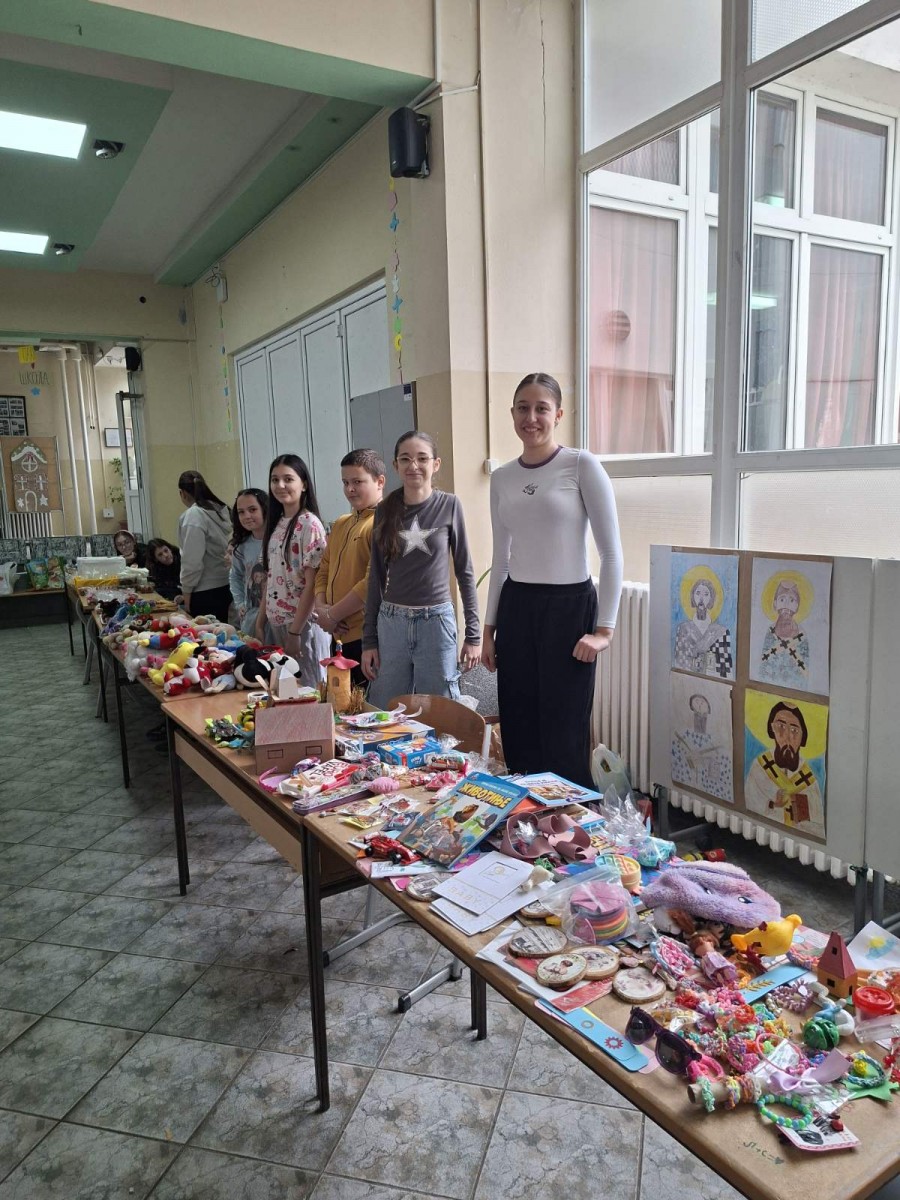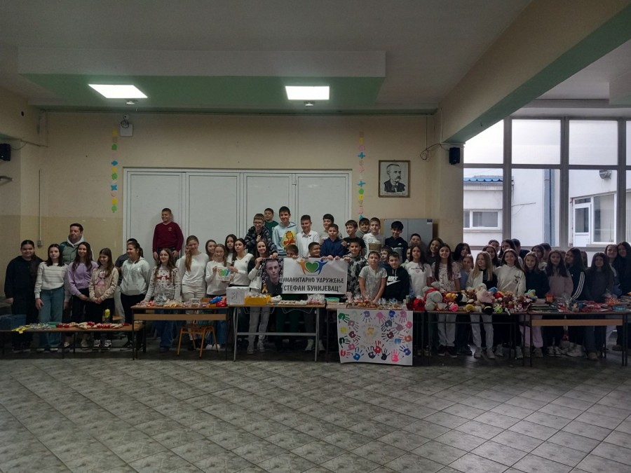 Povodom poziva Humanitarnog udruženja Stefan Bunijevac, u našoj školi je organizovan humanitarni bazar sa plemenitim ciljem – prikupljanjem sredstava za decu obolelu od raka. Školski hol i hodnici toga dana bili su ispunjeni osmesima, kreativnošću i iskrenom željom da se pomogne. Učenici mlađih i starijih razreda sa velikim entuzijazmom su doneli svoje igračke, narukvice, cveće, knjige, kao i raznovrsne domaće kolače pripremljene uz podršku roditelja i nastavnika. Svaki štand nosio je pečat dečje mašte, truda i dobrote. Posebnu toplinu čitavoj akciji dali su učenici odeljenja II5, zajedno sa svojom učiteljicom Katarinom Marković Prvulović, koji su organizovali predstavu i na nju pozvali roditelje i prijatelje škole. Kupovinom ulaznica gosti su dodatno doprineli uvećanju prikupljenih sredstava, a sama predstava bila je još jedan dokaz koliko deca razumeju značaj solidarnosti i zajedništva. Ni izdvojeno odeljenje u Zvečkoj nije ostalo po strani. Učenici su, uz podršku nastavnika kroz radionice u okviru obogaćenog jednosmenskog rada, pripremili i realizovali svoj bazar. Ponosni smo na učenike, roditelje i kolege koji su još jednom dokazali da naša škola nije samo mesto učenja, već i mesto gde se neguju prave vrednosti – empatija, solidarnost i odgovornost prema drugima. Zajedno smo pokazali da male ruke mogu da učine velika dela.